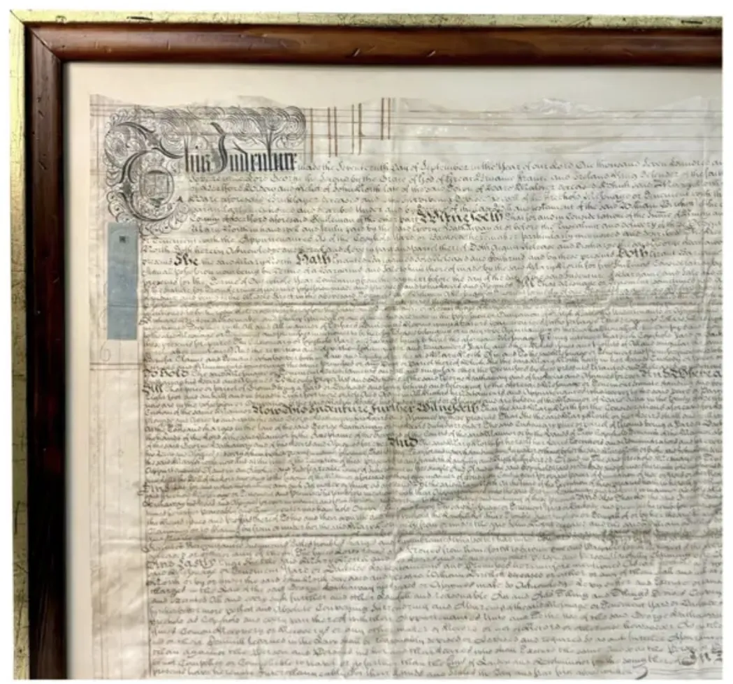 International Directory of 18th Century… Early 18th Century English Framed Indenture Document, Framed